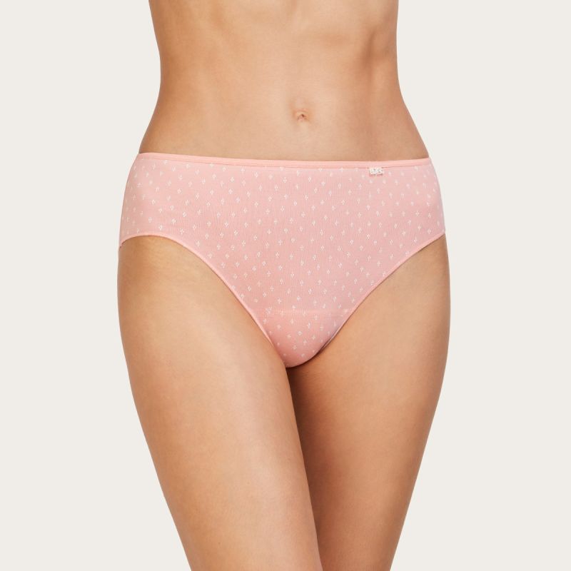 An AVET Midi knicker full of color and joy for summer days. Manufactured in cotton at our Mataró factory, this model features a small white floral print on two high-personality backgrounds: lavender and coral.