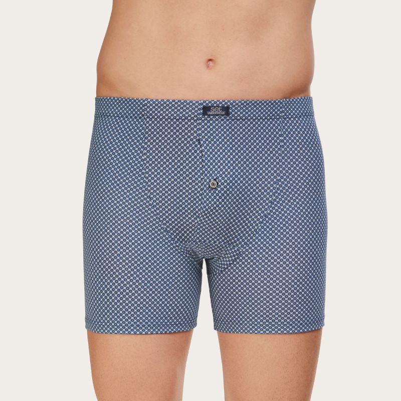 A buttoned open SET boxer that dresses with elegance from within. Manufactured in quality cotton at our Mataró factory, this model features a geometric print that covers the entire fabric, creating an elegant and formal effect with a lot of personality. Available in navy and forest green. The cotton-covered elastic waistband guarantees a soft and comfortable fit for the whole day.