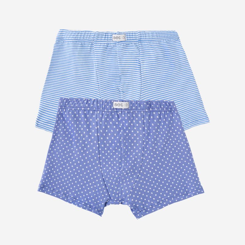 Fabricado en algodón suave en nuestra fábrica de Mataró, este pack reúne dos bóxers infantiles con mucho carácter: uno azul con estampado de burbujas y otro de rayas horizontales. Dos diseños que combinan a la perfección y que los niños querrán ponerse una y otra vez por su comodidad.